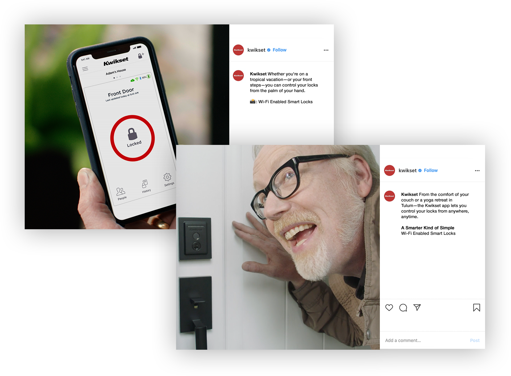 To highlight the smarter side of Kwikset, we turned to a favorite icon of innovation: the former co-host of MythBusters, Adam Savage. Adam’s fun and uniquely passionate approach to tech and innovation aligned perfectly with Kwikset’s own passions for security, and the kind of easy to use technology that we can all geek out on. To communicate the “simpler” side of the equation, Adam was paired with a stylish, easy-going partner who isn’t all that concerned with the vast innovation that goes into Kwikset products, but truly appreciates their great design and simple features. Together, the duo find themselves in conversations that focus on the unique duality that Kwikset provides.